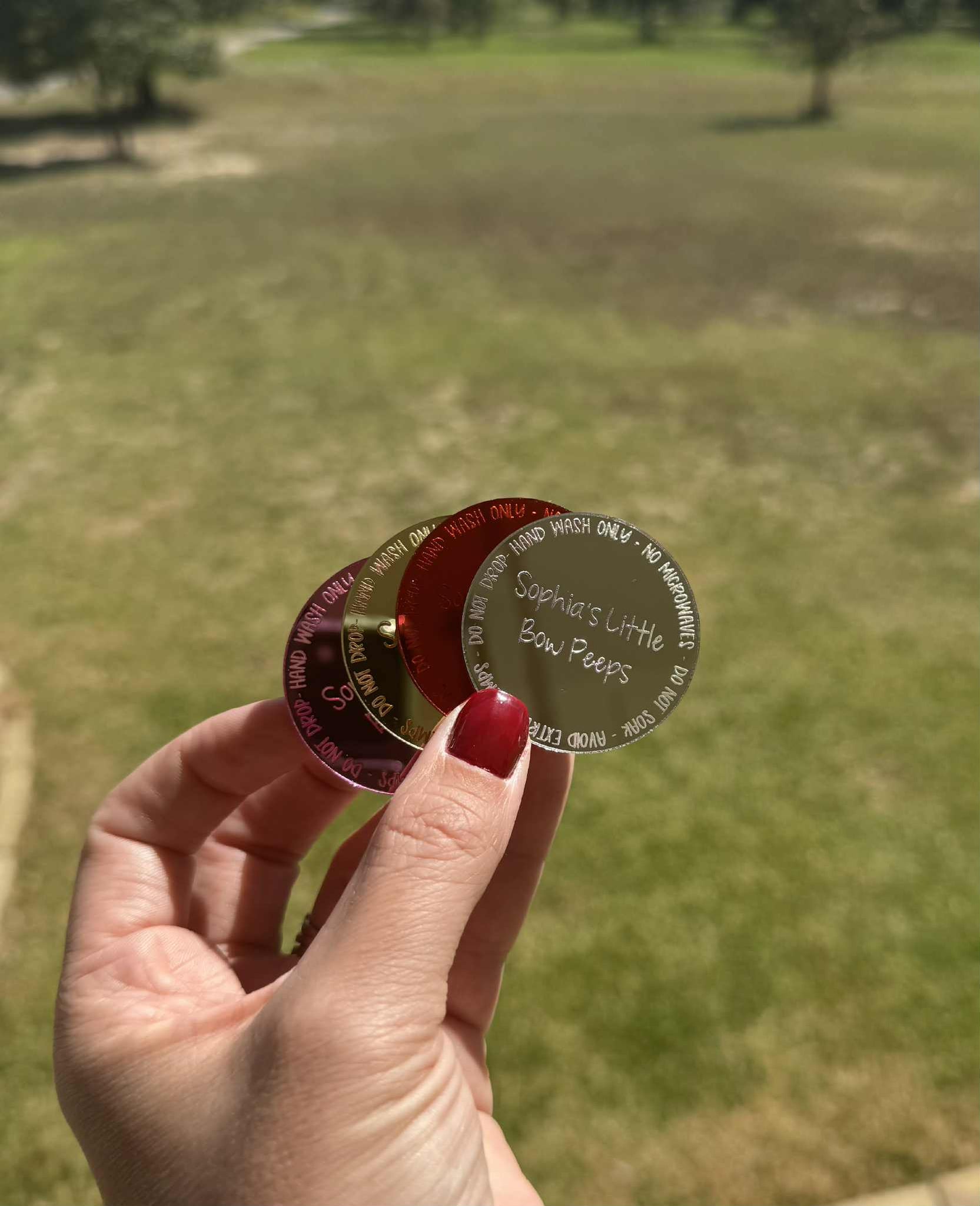 These acrylic discs are 1.75” wide and 1/16” thick — the perfect little accent for showcasing your brand name or a short phrase. While also including care instructions with each one! They’re made from high-quality acrylic with a sleek, shiny finish that catches the light just right.