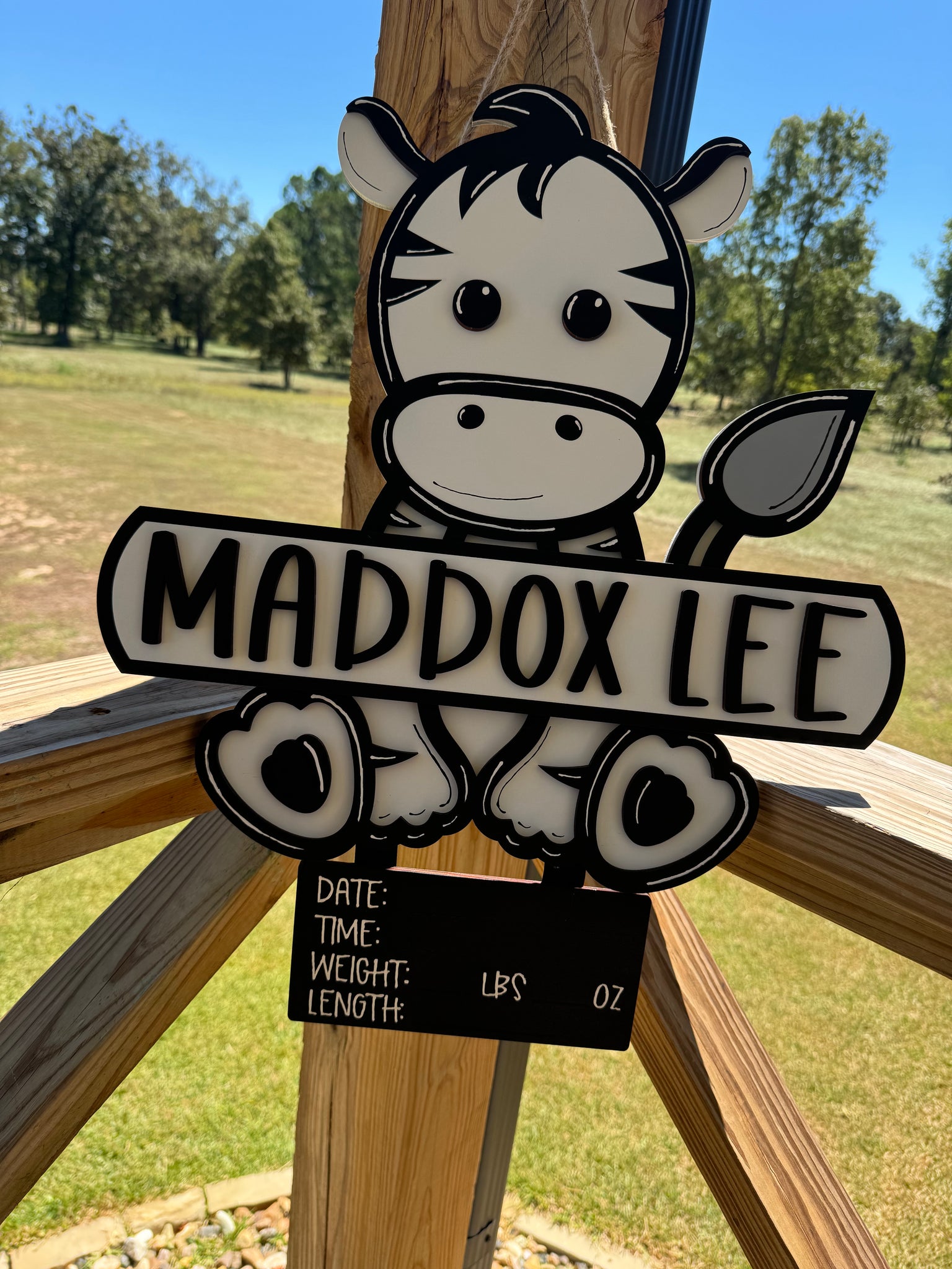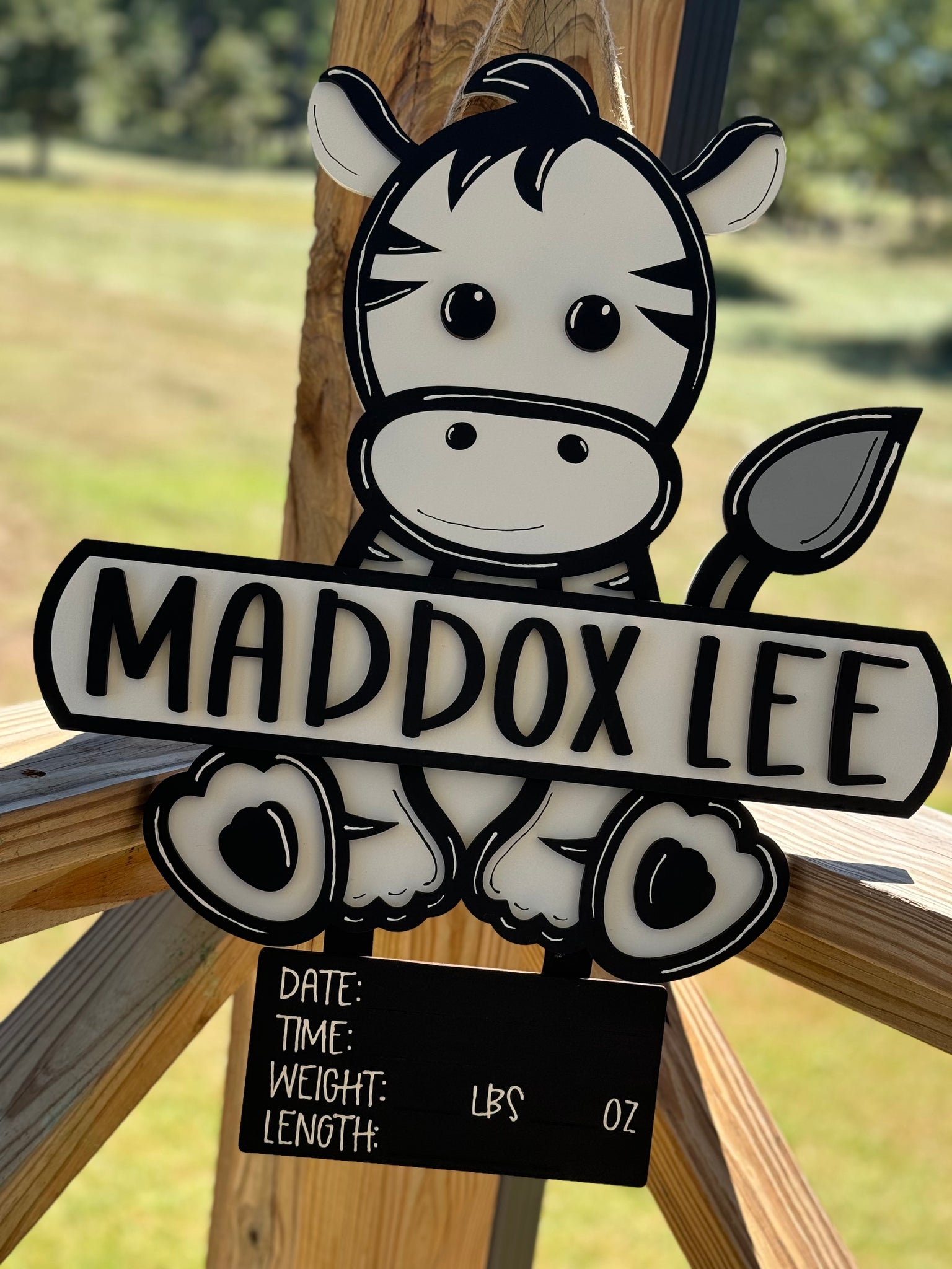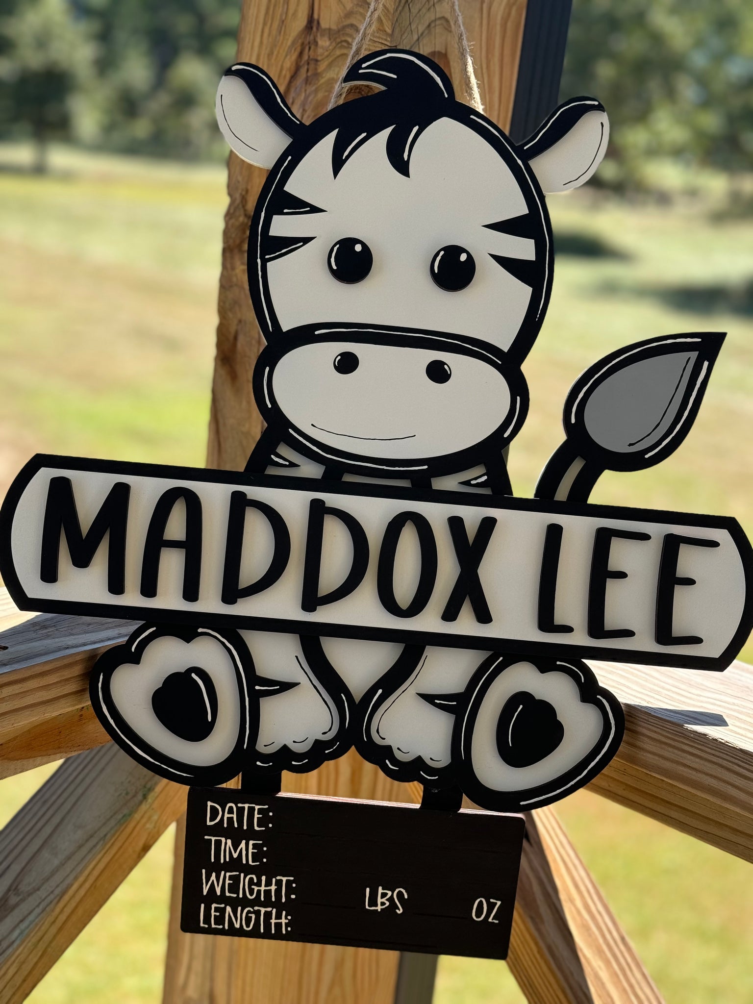Welcome your little one in style with this adorable custom zebra nursery door hanger! Perfect for hospital doors, nursery decor, or as a keepsake, this piece is both practical and sentimental.